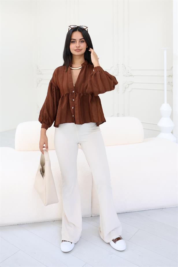 - Chic peplum style with button-down front - Rich brown hue for sophisticated appeal - Flattering silhouette accentuating the waist - Functional button closure; elegant peplum flare