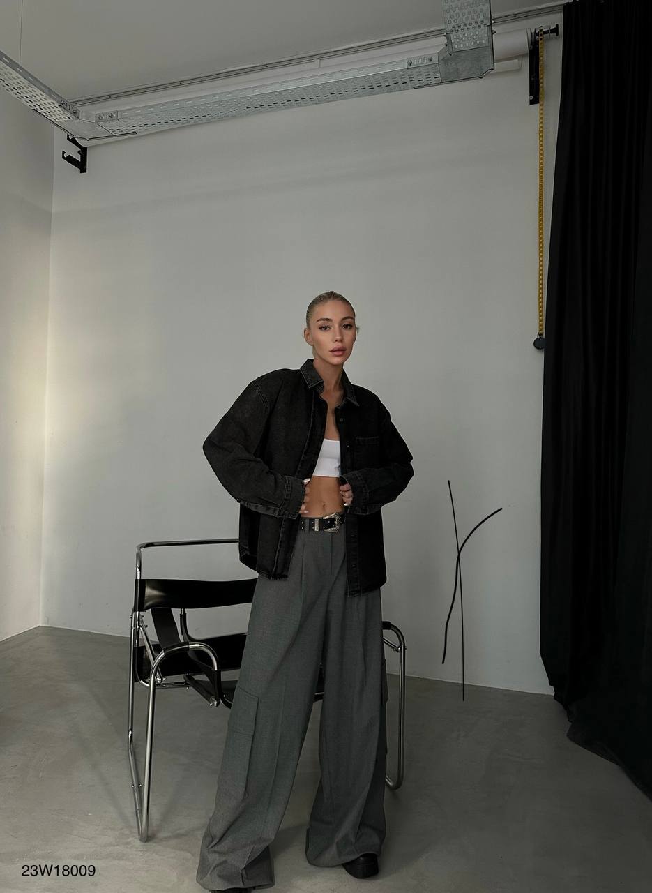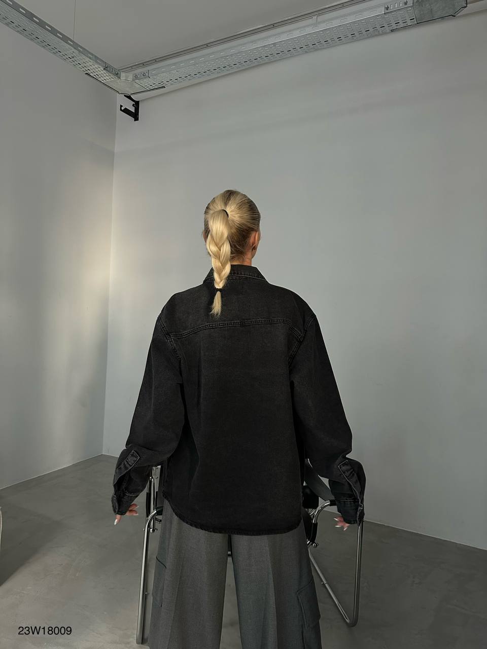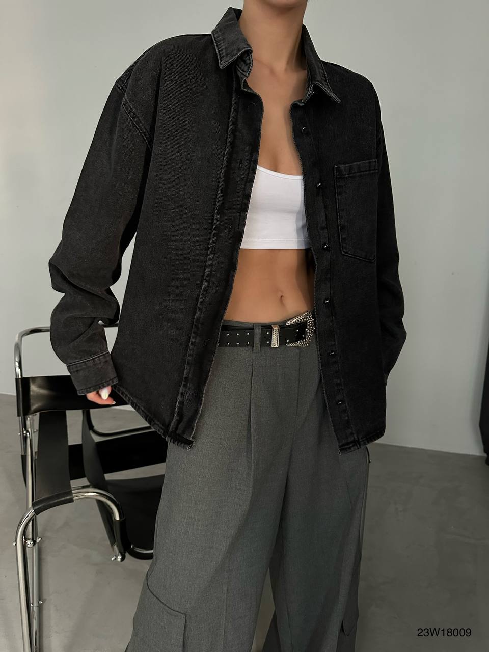 - Contemporary oversized fit. - Durable black denim fabric. - Generously tailored for a relaxed look. - Button-up front; classic collar.